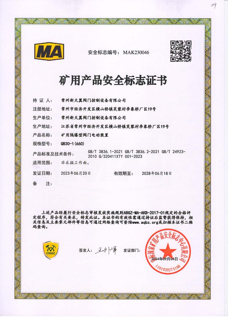 礦用隔爆ZB10-24中國國家強制性產品認證證書110.2