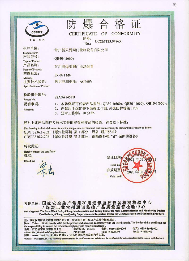 礦用隔爆QB127V中國國家強制性產品認證證書105.2